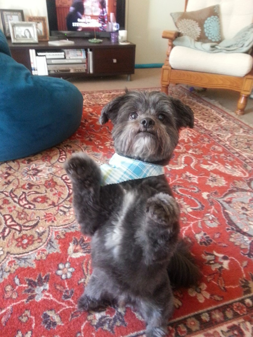 Wallie is the (one dimensional) embodiment of the perfect dog. He loves everyone, human and canine. (He probably even likes cats.) He’s easy-going, affable, unflappable. Nothing scares him. Nothing even rattles him. He’s a friendly, fun, cool cucumber of a dog. Wallie is always ready for anything (and insists of being the center of everything). He is, in short, the dog we all strive for.